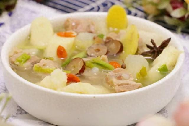 原料:山药100g 茯苓10g 乳鸽50g 精盐1g 大枣3g 小葱3g